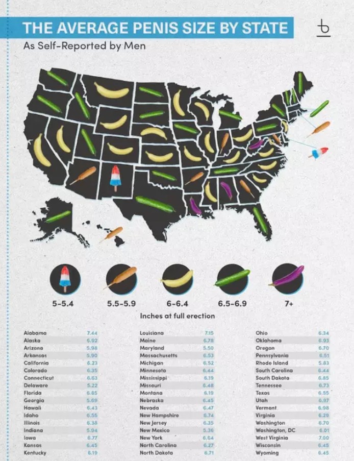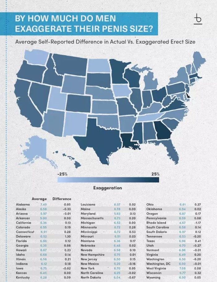 Surprisingly, 12 states reported stating penis sizes under their actual, with men in Rhode Island actually understating their length by 1.17 inches.