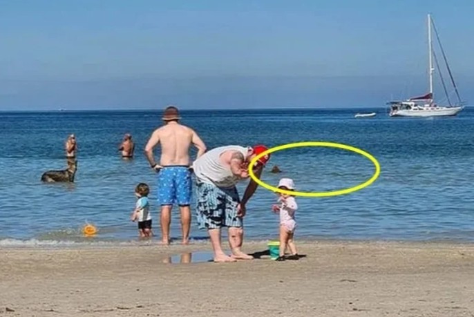The picture, taken at Carrum Beach, captured a father and his young daughter happily waving at the camera, seemingly unaware of what lurked behind them.
