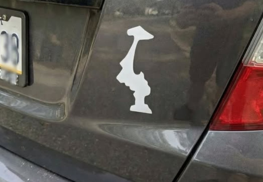 Unlike flashy state flags or bold logos, the upside-down sticker says: