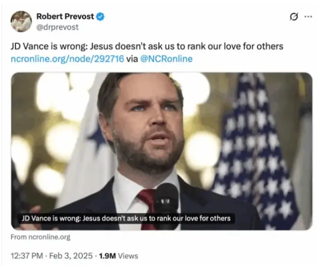 Ten days later, Pope Leo, as Cardinal Robert Prevost, shared another piece from a Jesuit publication, titled, “Pope Francis’ letter, JD Vance’s ‘ordo amoris’ and what the Gospel asks of all of us on immigration.”