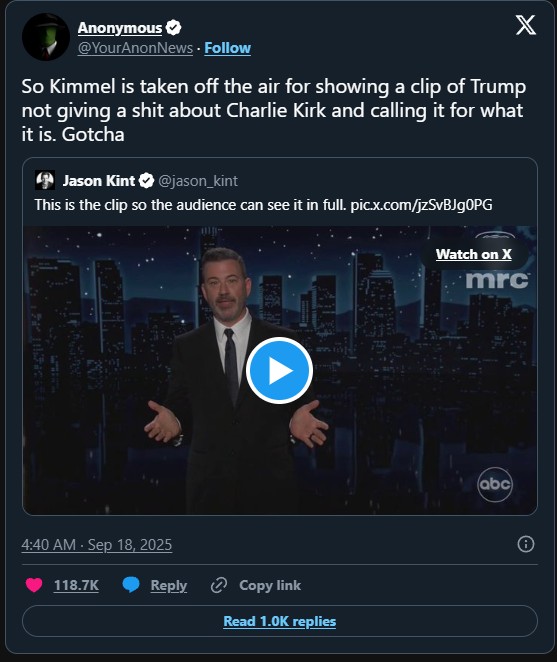The post read: “So Kimmel is taken off the air for showing a clip of Trump not giving a s*** about Charlie Kirk and calling it for what it is. Gotcha”.