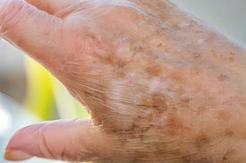 These marks are often called age spots or solar lentigines. They appear after years of sun exposure because melanin, the pigment in our skin, becomes unevenly distributed.
