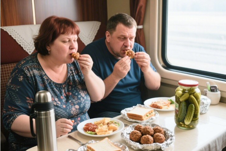 I carefully laid out my supplies on the little table: homemade cutlets wrapped in foil, a jar of pickles, sliced sandwiches with sausage, apples, cookies, and a thermos of strong tea. It was supposed to last me the whole long trip to the sea. I imagined myself eating slowly while watching the passing landscapes, reading a book, and sipping tea from my favorite cup.