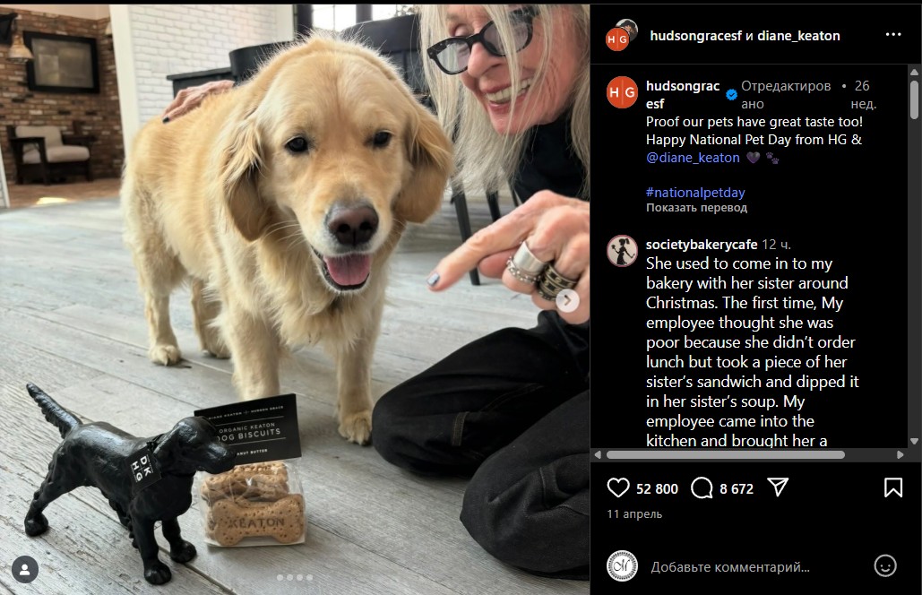 In the post on 11 April, Keaton celebrated National Pet Day with a picture of her dog, a Golden Retriever called Reggie.